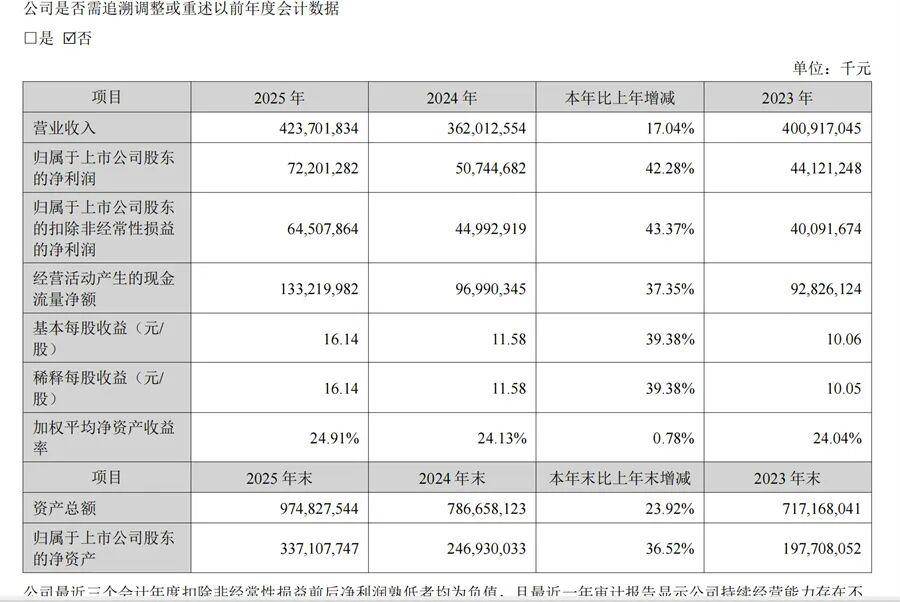 3月9日晚,动力电池产业龙头宁德时代发布2025年年报。数据显示,2025年,宁德时代实现营业收入4237.01亿元,同比增长17.04%,实现归母净利润722.02亿元,同比增长42.28%。