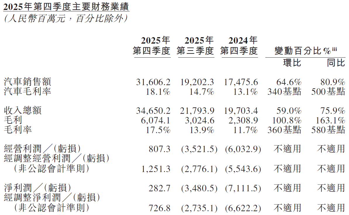蔚来Q4实现经营利润8.07亿元,去年同期还是亏损60.3亿元;非GAAP调整后经营利润更是达到12.51亿元,调整后净利润7.27亿元。这是蔚来成立以来,第一次在一个完整的季度实现净利润转正,用CFO曲玉的话说,这是公司经营业绩的重大里程碑。