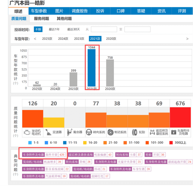 车质网数据显示,2021 款皓影质量类投诉总量达 1041 件,其中 “车身附件及电器部件开裂” 问题投诉 419 件,占比约 40.3%,而天窗卡扣断裂是该类别下的核心诉求点。更值得关注的是,皓影车型投诉销量比(万分之,数值越小质量表现越好)从2022年的11.3,攀升至2026年的44.9,涨幅约2.97倍,意味着 “每卖出 1 万辆皓影,投诉量增加近3倍”,质量口碑持续下滑。