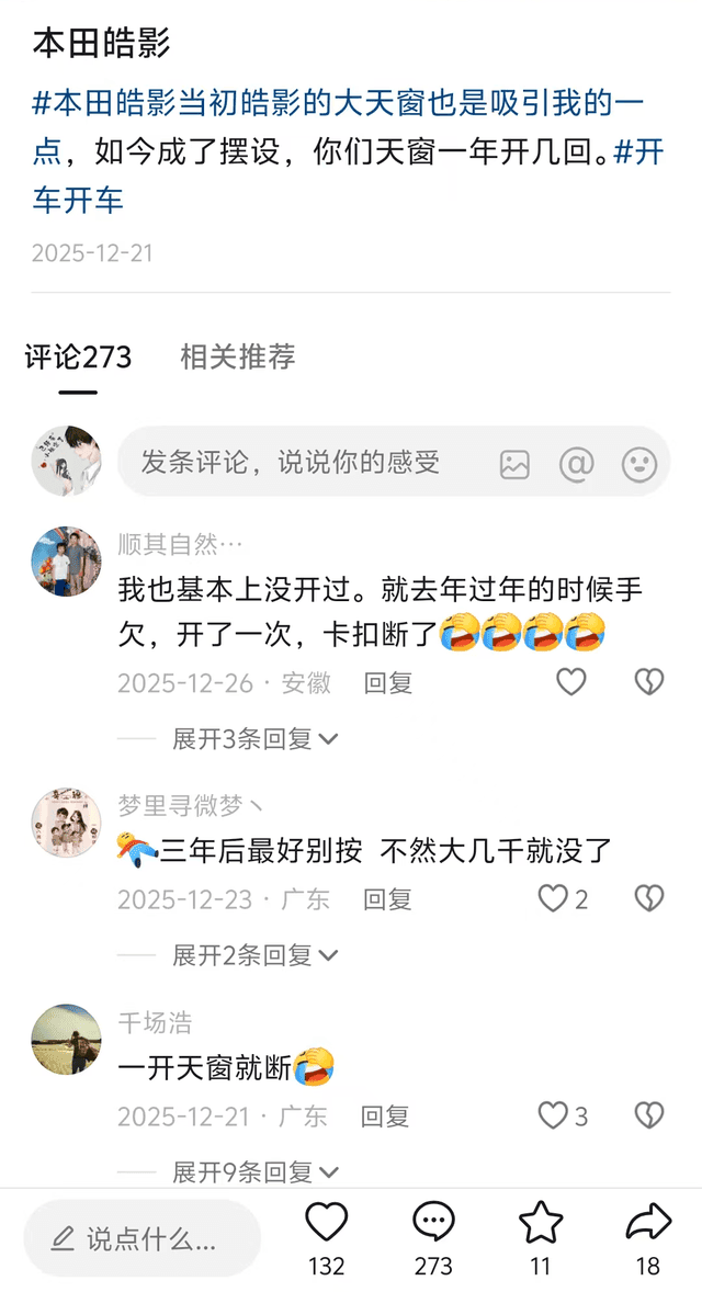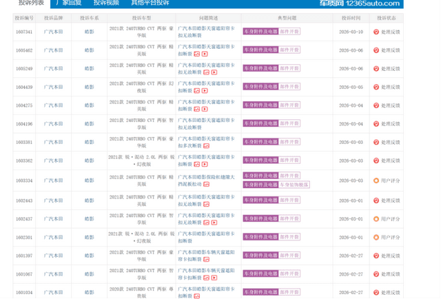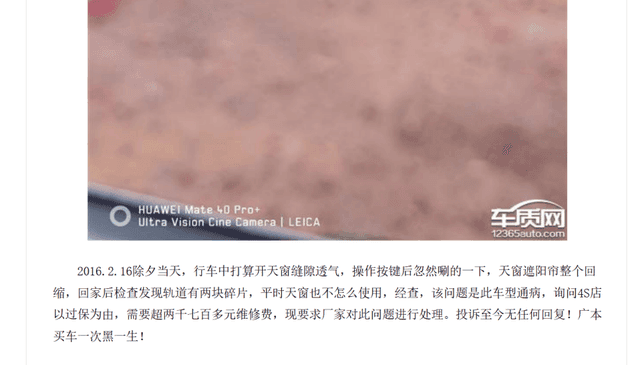另一位车主则在2026年2月16日(除夕)遭遇卡扣断裂,“开车时天窗遮阳帘突然回缩,检查发现卡扣碎片,4S 店要2700多元维修费,投诉至今没任何回复,广本买车一次黑一生!”