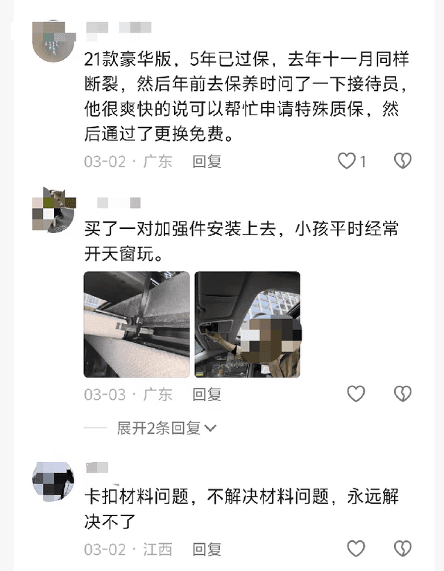 “我查了很多车友反馈,发现大家都是刚过保就出这问题,不是我一个人的车这样。” 叶先生告诉车友公社,车主们普遍认为该卡扣断裂的原因是 “原厂塑料材质不耐高温、设计存在老化缺陷”—— 南方夏季车内高温暴晒后,塑料卡扣易变脆断裂,北方冬季低温也可能加速老化,“这不是人为使用不当,而是产品本身的问题”。