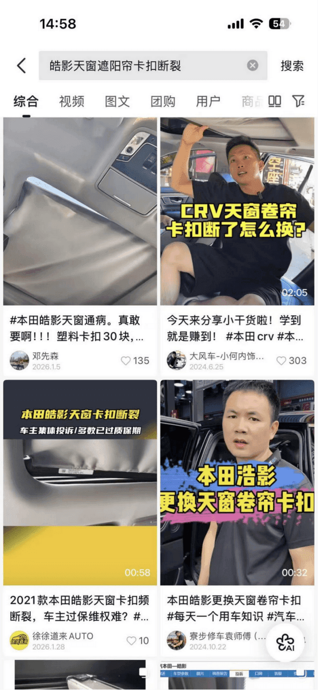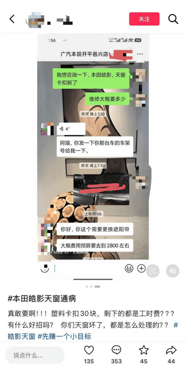 车友公社调查发现,叶先生的遭遇并非个例,不少车主遭遇了广汽本田皓影天窗遮阳帘卡扣断裂的问题,并且问题多集中在车辆刚过质保期时爆发。车友公社在采访中了解到,维修费高达近3000元、厂家无统一处理标准、投诉后长期无回应等问题,更让车主陷入维权困境。