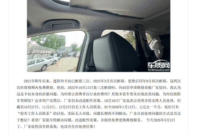 车友公社在车质网发现,不少车主的投诉 “石沉大海”。一位2021年购车的车主表示,遮阳帘卡扣已断裂三次:2022年两次在保内免费更换,但2025年10月第三次断裂后,厂家驳回免费维修申请,“从2025年10月投诉到2026年3月,厂家只说‘安排人员处理’,却没人联系我,问题拖了半年没解决”。