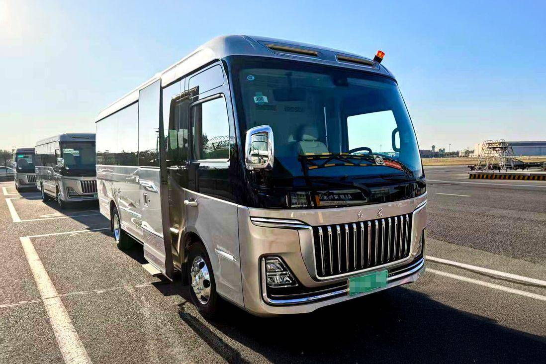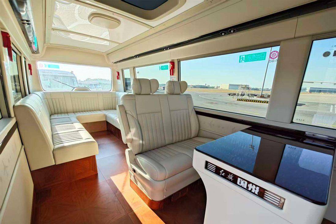 内饰方面,国悦REEV传承了家族特点,采用超大空间设计,整车内长5443mm、内宽1900mm、内高1900mm,同级领先。17座车型座椅间距可达865mm,充分保证了每一个乘客的舒适性。为更好满足不同场景的使用需求,红旗国悦REEV提供17、19座多种布局可选。此外,行业首创副驾驶车门设计,极大提升了接待场景随行人员上下车的便捷性,为服务人员提供了更好的悦享体验。