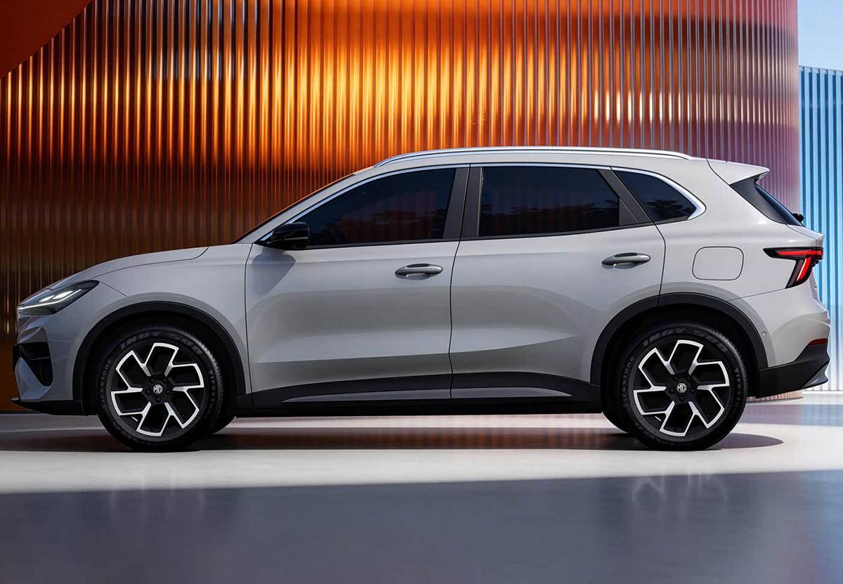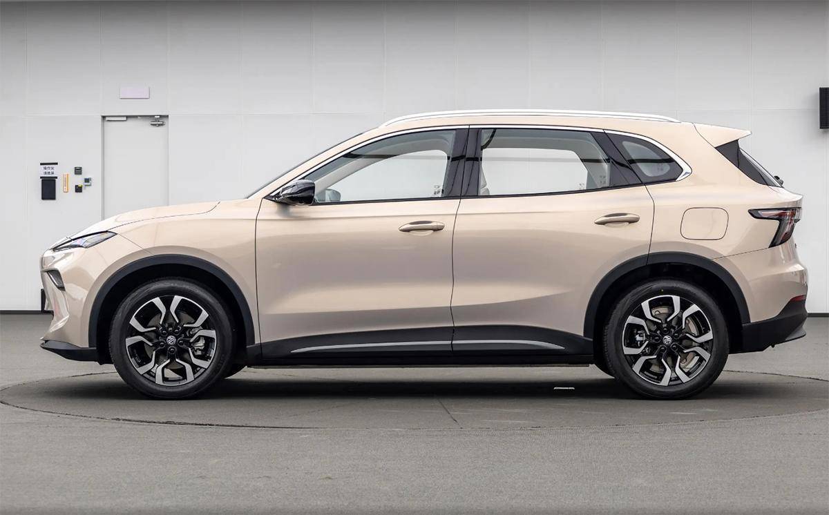 值得注意的是,新车的车身侧面整体造型和目前在售的名爵MG ES5基本一致,差别主要是轮毂造型不同。车身线条简洁干练,提供了镀铬效果的车顶行李架,车身下部隆起筋线造型有着不错的力量感。轮眉以及车身下包围使用了黑色涂装。