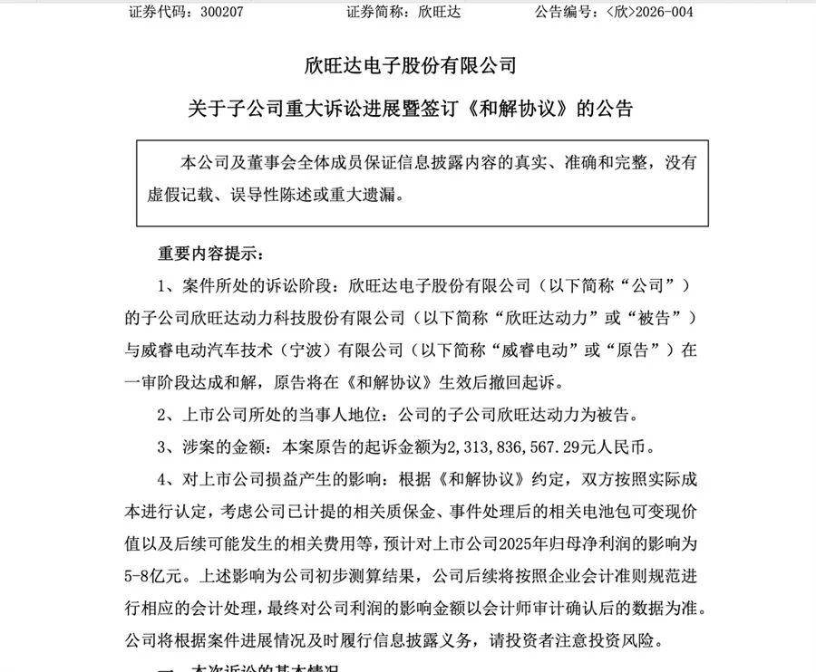 2025年12月,吉利系公司威睿电动汽车技术(宁波)有限公司起诉欣旺达动力,指控后者在2021年6月至2023年12月期间供应的电芯存在质量问题,并索赔23亿元。今年2月6日,欣旺达发布公告称,与威睿电动和解,赔偿金额从23亿元锐减到6.08亿元。