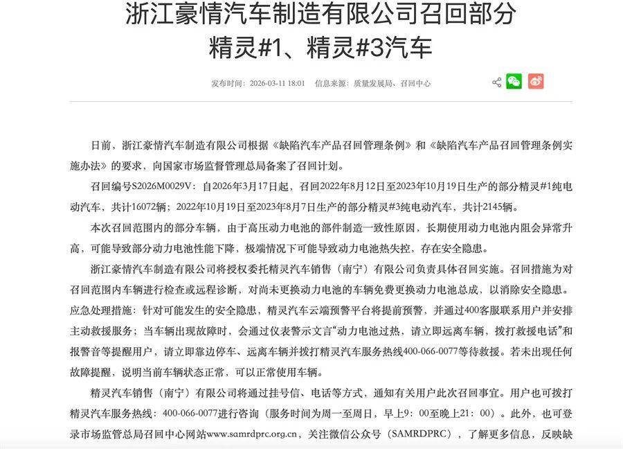 【文/财圈社&道哥说车 听风吟】3月12日,国家市场监督管理总局信息显示,吉利旗下浙江豪情汽车制造有限公司决定自2026年3月17日起,召回部分smart精灵系列电动汽车,包括smart精灵#1、smart精灵#3,共计18217辆。