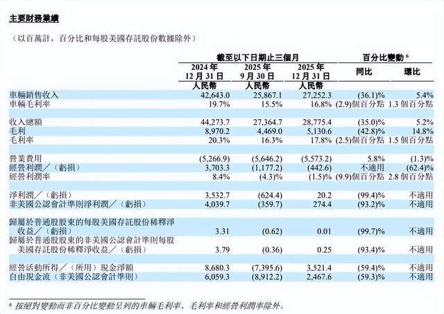 伴随销量萎缩而来的是盈利能力的急剧恶化。2025年,理想汽车全年总收入降至1123亿元,同比大幅下降22.3%,其中车辆销售收入1067亿元,同比下滑23.0%。更为严峻的是净利润的暴跌,全年净利润仅为11亿元,较2024年的80亿元缩水高达85.8%,车辆毛利率也从上年的19.8%跌至17.9%。