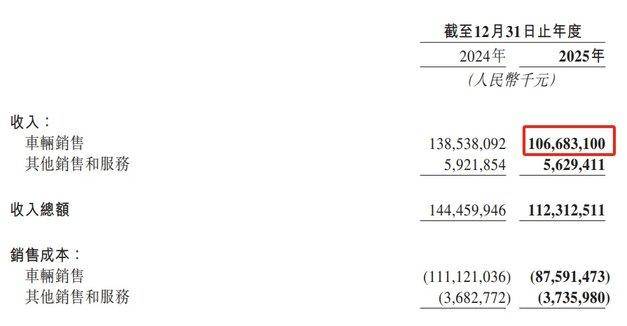 再看全年数据,2025 年理想汽车营收 1123.12 亿元,同比下降 22.3%,虽然营收下滑,但依然破千亿,连续三年保持这个量级,行业头部的位置还在。