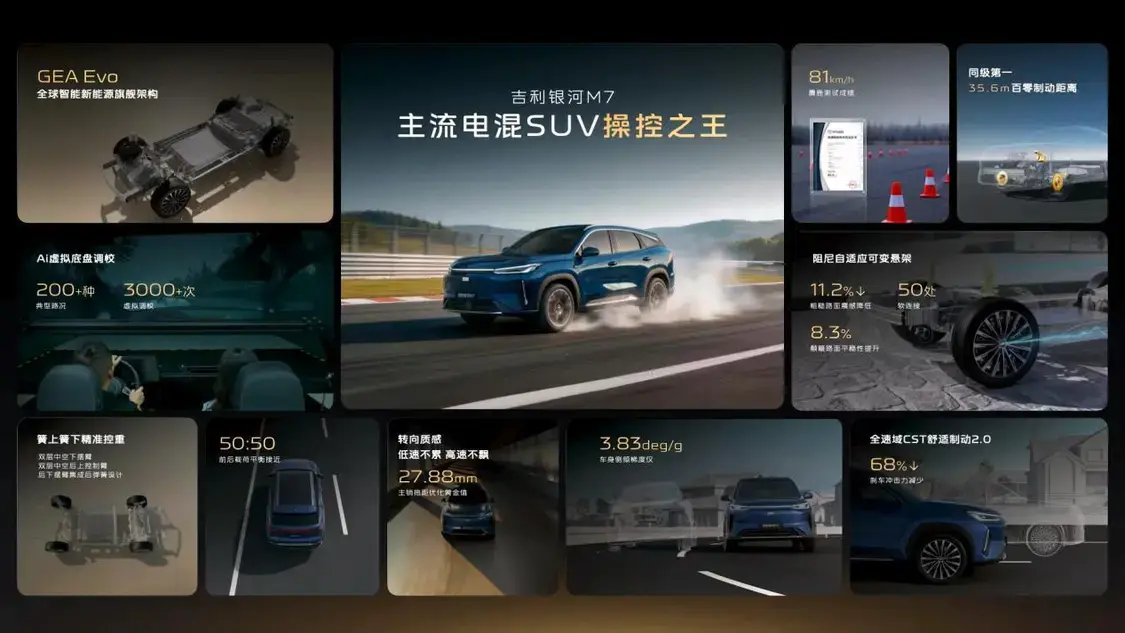 定位于“主流电混SUV颠覆者”,吉利银河M7的三大技术尖点,每一项都直击新能源用户续航焦虑、操控安全、用车成本的核心痛点,构建起同级领先的产品竞争力。
