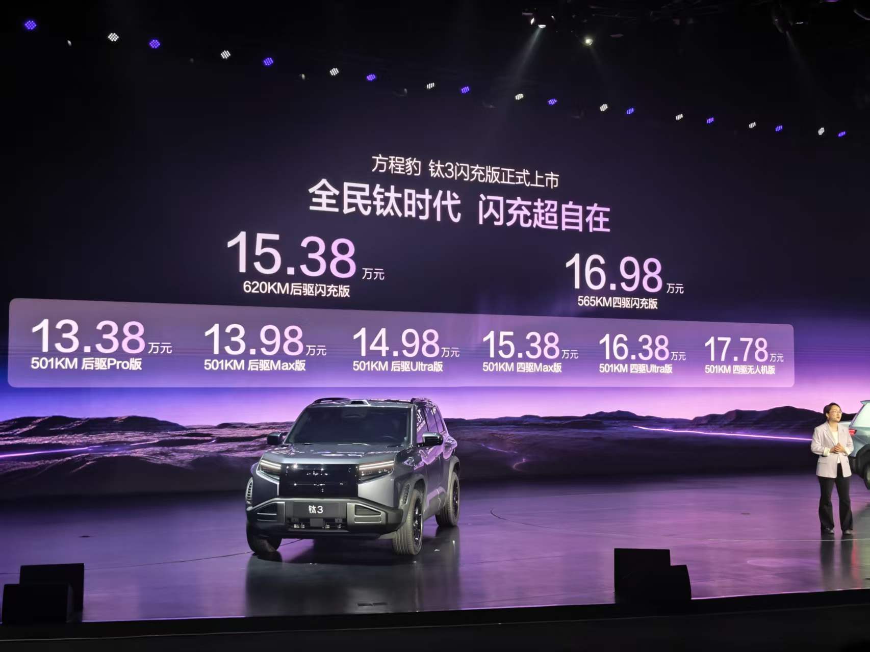 今晚方程豹钛3闪充版正式上市了,阿维这次也看了发布会,简单总结一下,9分钟充电97%的颠覆性补能速度与15.38万元起的诚意定价,老实说真的有点超出预期了。