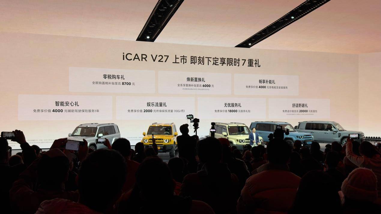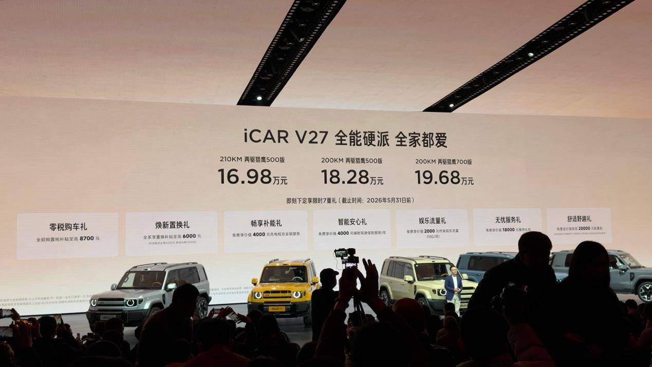 3月13日,iCAR V27正式上市,新车共推出三款配置,210KM两驱猎鹰500版指导价16.98万元,200KM四驱猎鹰500版指导价18.28万元,200KM四驱猎鹰700版指导价19.68万元。作为一款定位“家庭新硬派”的中大型方盒子SUV,V27在设计风格、空间表现、动力形式以及智能化水平等多个维度,试图在家用与个性之间找到新的平衡点。