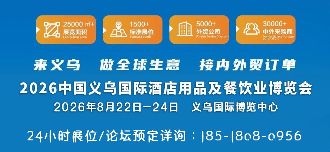 “中国义乌国际酒店用品及餐饮业博览会”为积极落实义乌展会专业化办展改革政策,并取得义乌市政府重点支持的国际化行业品牌展会。2026中国义乌国际酒店用品及餐饮业博览会于2026年8月22-24日在义乌国际博览中心盛大举行,展会依托义乌外贸优势和国际市场辐射力,为行业搭建了国际交流合作平台,取得了丰硕成果,得到了全球业界领袖及义乌市领导和有关部门的赞誉和好评。24小时展位/论坛预定详询:I85-I8o8-o956