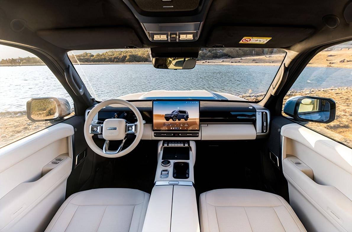 V27的造型第一眼就抓住了眼球,超5米的车长,接近1:1的宽高比,直立A柱,超低窗线。这不是简单的方盒子复刻,而是在经典越野比例中融入了未来科技感。高集成度科技岛的设计语言,让这台车在秩序与简洁中透出精致感。