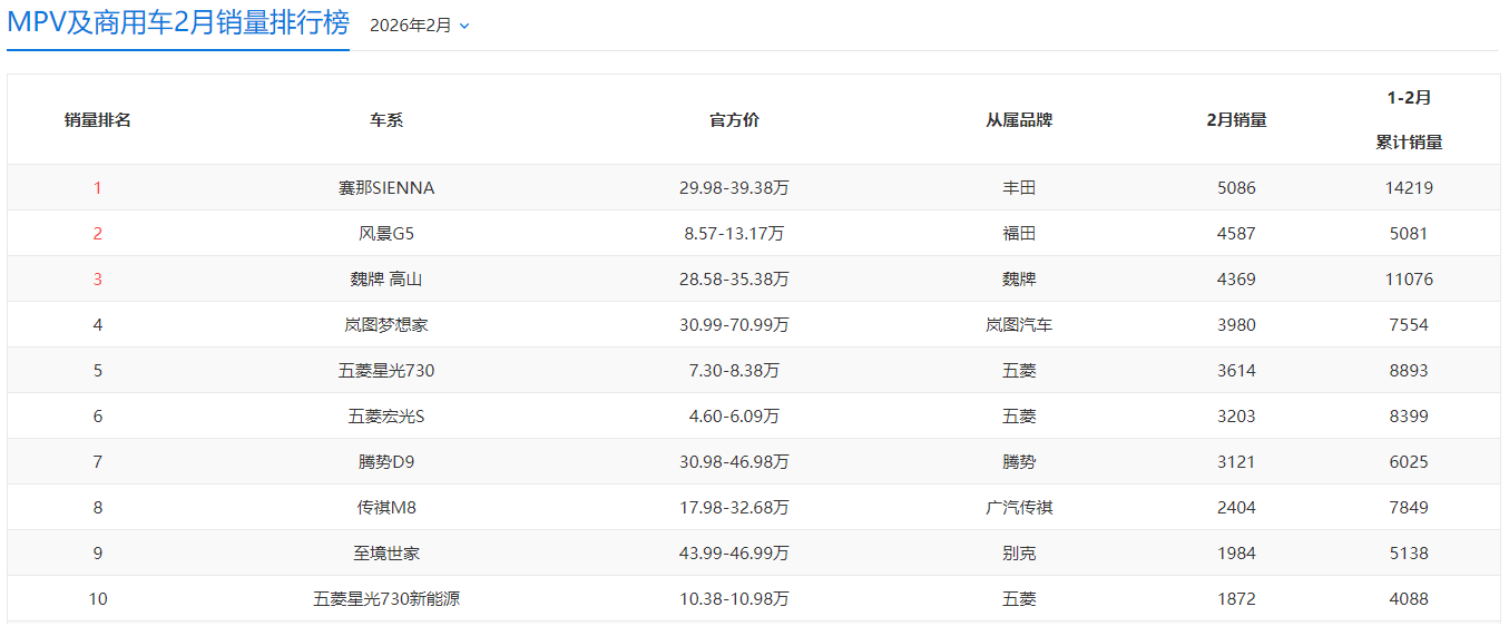 以下为2026年2月MPV零售销量排名。