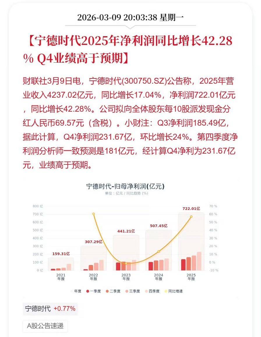 3月9号晚,宁德时代发布2025年度业绩公告,全年营收4237.02亿元,同比增长17.04%;净利润直接飙到722.01亿元,同比大涨42.28%,经营现金流净额超1300亿,这份成绩单,直接把全行业车企都比下去了。