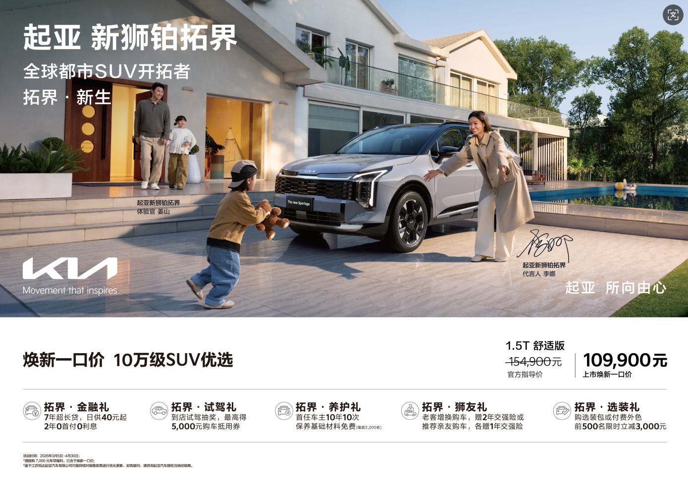 作为“全球都市SUV开拓者”,狮铂拓界以全球品质为基、以原创技术为本,历经33年历史传承、5代车型革新,2025年全球销量约57万辆,累计销量突破800万辆,是全球市场当之无愧的传奇SUV。起亚新狮铂拓界继承了“Sportage”经典品质,开启了家族式设计新境,并在驾驶质感、空间体验、智能安全、科技配置等维度全面进阶,重新树立了合资紧凑型SUV的价值标杆,为中国用户带来兼顾自由探索与家庭出行的最具性价比选择。