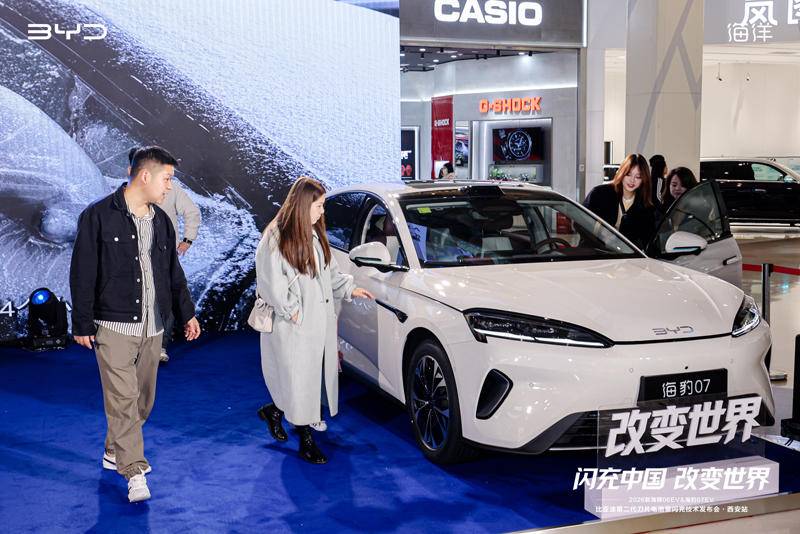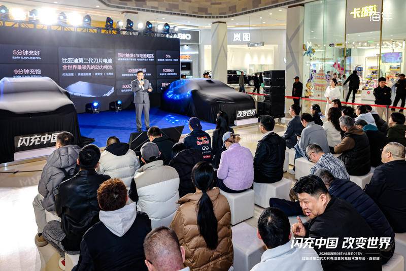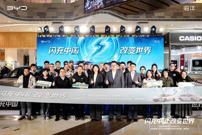 3月14日比亚迪携第二代刀片电池及闪充技术在古都西安与消费者见面,当日活动在西安益田假日世界购物中心以“闪充西安,双车登场”为主题,现场重磅发布了比亚迪带给行业的划时代技术以及首批搭载第二代刀片电池与闪充技术的2026款海狮06EV与海豹07EV等两款新车,标志着比亚迪闪充技术正式落地西北市场,而比亚迪海洋网两款新车以“闪充+长续航+高安全”的三重优势,为西北用户带来更省心、更便捷的纯电出行新选择。