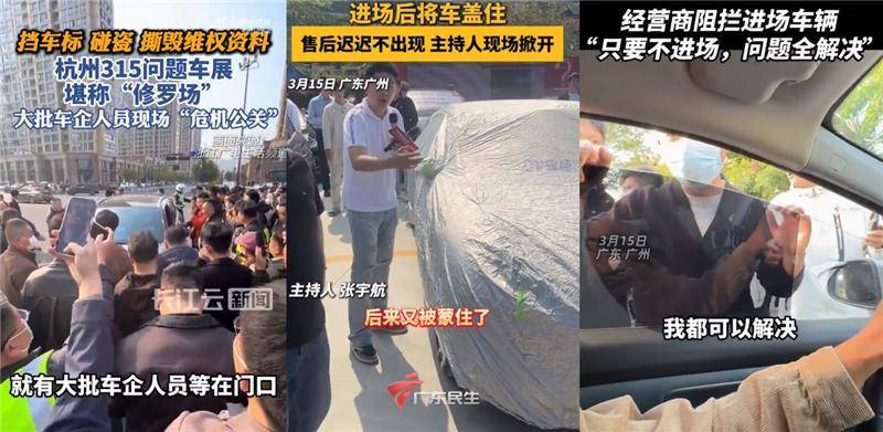 问题车展现场,有一些佩戴口罩的神秘人站在想要进场的车辆面前进行阻挠,有人表示只要车辆不进场,就帮助解决车主所投诉的问题。已经进场的车辆有的被盖上了车衣,轮毂logo处被其他品牌车型的展板所遮挡,也有人现场起草协议并盖章,就地解决车主的问题。有热心吃瓜群众表示,现场阻拦车型大多为自主品牌,如果是奔驰、宝马、奥迪等外资品牌则没有受阻。