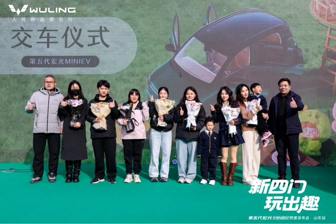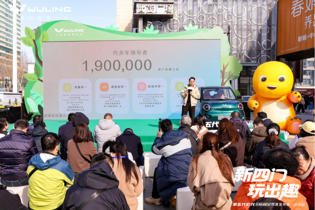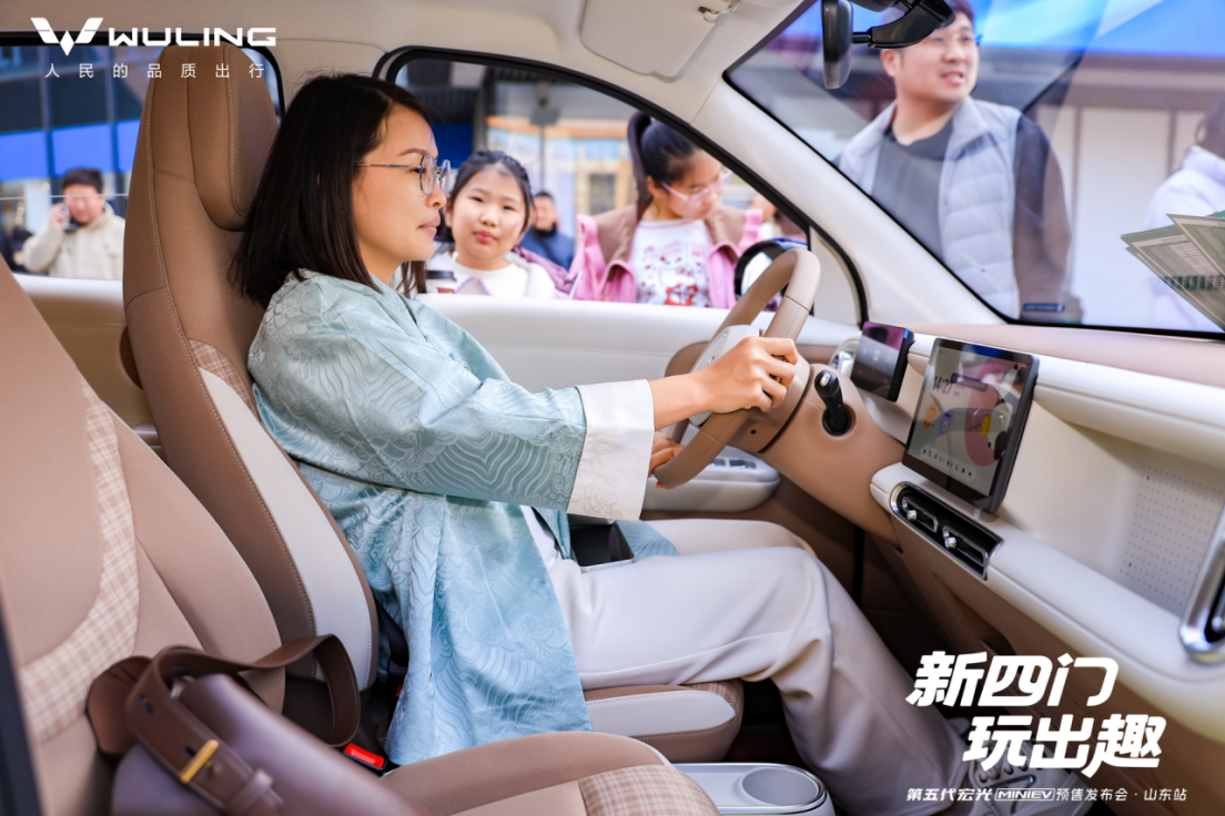 2026年3月15日,“新四门 玩出趣——第五代宏光MINIEV预售发布会·山东站”于济南世茂国际广场正启。本次发布会特别携手Q宝与奶龙两大潮流IP,为现场注入了更多快乐基因。通过精心设计的静态展示与动态试驾环节,全方位呈现了新车的玩趣美学设计、“四门四座”空间表现、进阶驾乘舒适性以及全维安全守护表现,获得了现场体验者的高度认可。