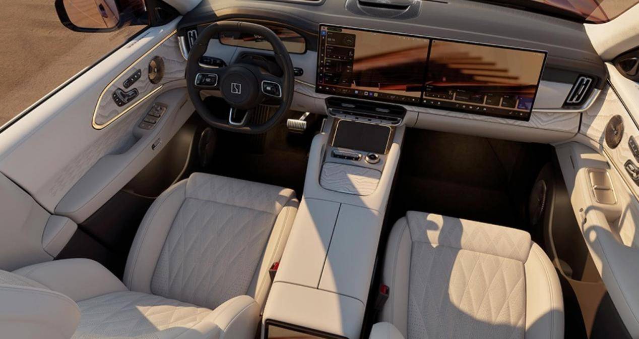 内饰部分是环抱式座舱布局,采用Nappa真皮、翻毛皮车顶、没有廉价的塑料感,采用的是16英寸OLED双联屏(中控屏+副驾娱乐屏)搭配AR-HUD,组成四屏交互矩阵,双高通8295芯片驱动,怀挡式的设计内部空间是释放出来了,提供五座、六座两种布局。