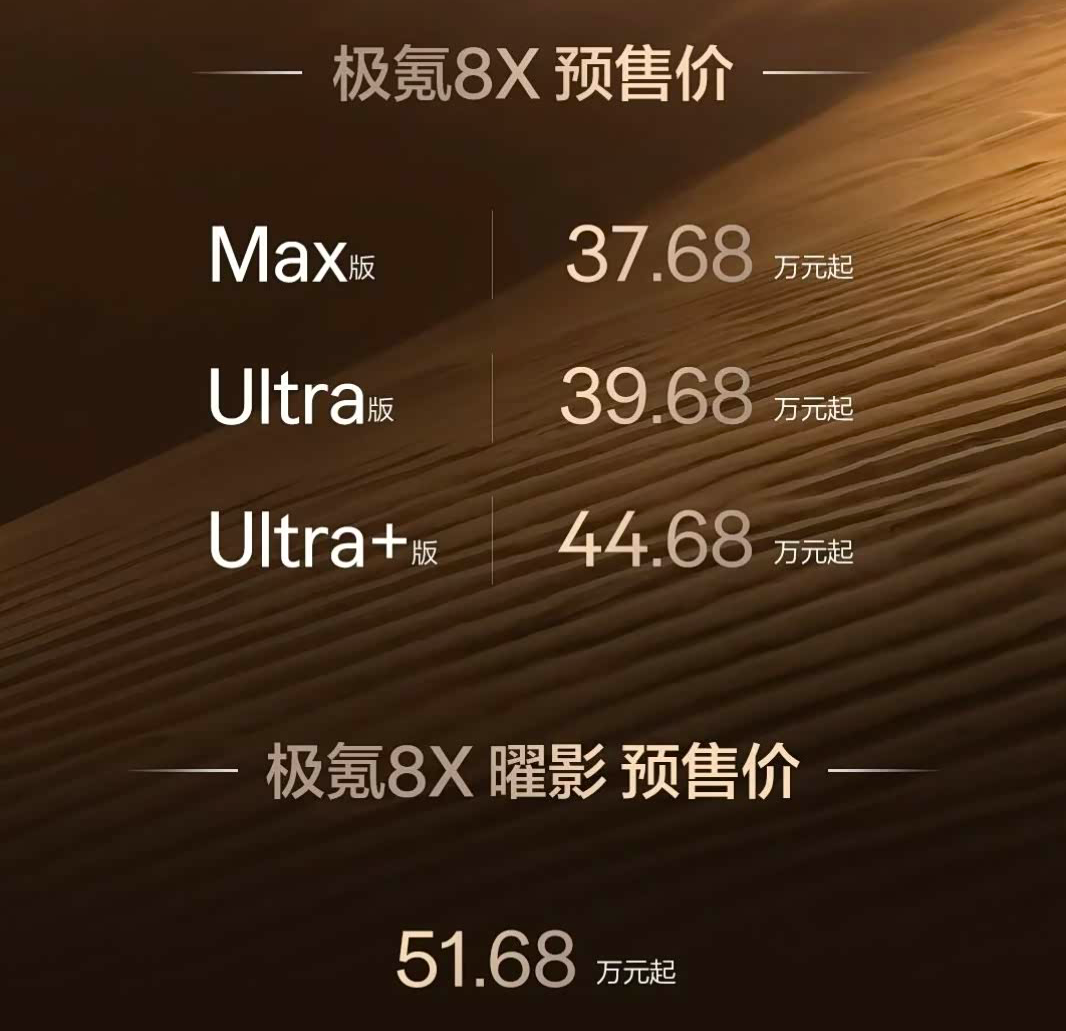 先看款型,共有4款,预售价格区间为37.68万-51.68万元。其中,最贵的那款叫做“曜影版”,属于顶配级,剩下的则分别是Ultra+、Ultra、Max版。