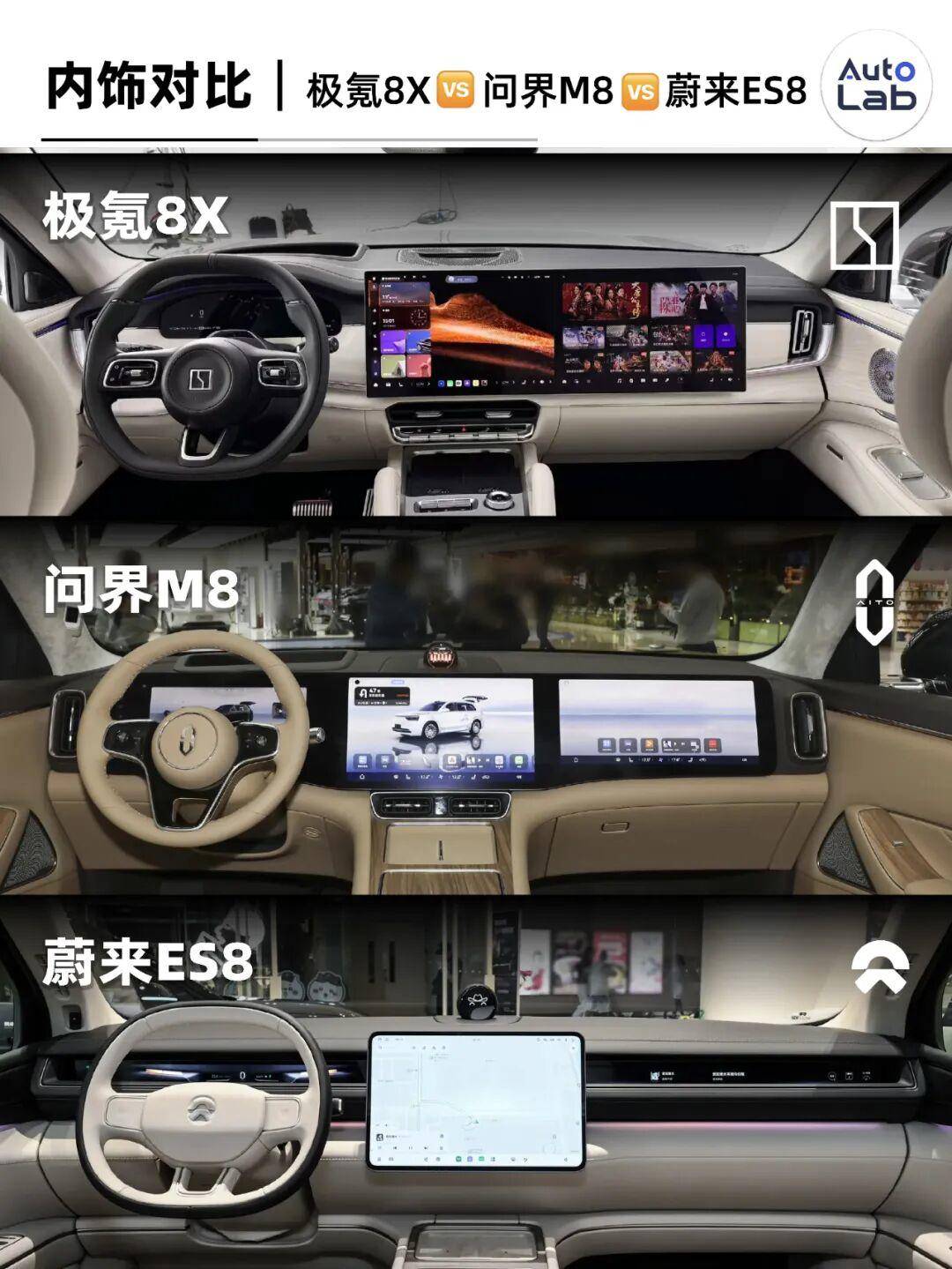 目前市面上叫“8”的SUV不少,我们挑了最热门的两台——问界M8和蔚来ES8,跟极氪8X放一起看一看。