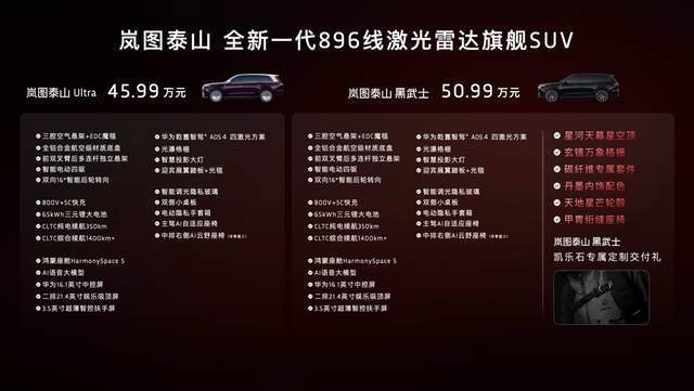 2026年3月17日,岚图汽车召开以“远见”泰山技术焕新发布会。岚图联合央视新闻,交出了一份极具分量的时代答卷,全新一代896线激光雷达旗舰SUV岚图泰山Ultra版正式启动量产交付,新车售价45.99万元。同时,岚图泰山黑武士版开启大定,新车售价50.99万元。岚图以惊人的速度,率先将顶尖的896线激光雷达量产装车。目前,全国展车及试驾车已全面到店。这不仅体现了岚图强大的体系力,也标志着岚图泰山Ultra及黑武士凭借“硬核机械+顶尖智驾”的双重护城河,重新标定了9系旗舰SUV的价值新高度,让世界看到,智慧出行的未来将由中国来定义。