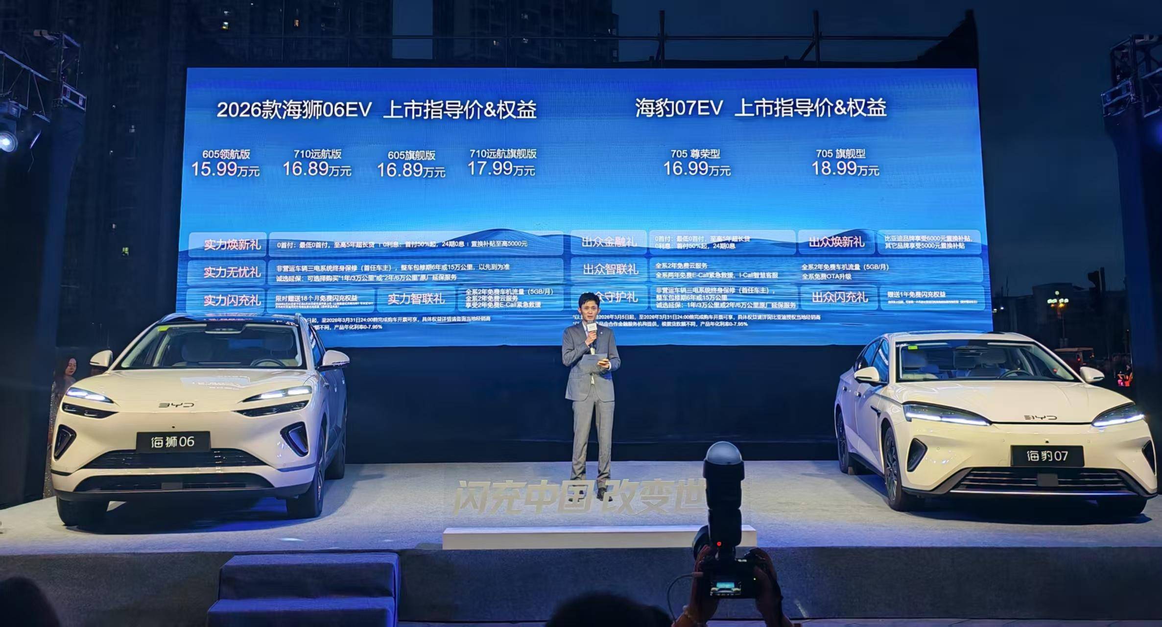 在全场嘉宾的热切期待中,两款新车的价格也在上市盛典中正式揭晓,其中,2026款海狮06EV官方指导价为15.99万元-17.99万元,并推出实力焕新礼、实力无忧礼、实力闪充礼、实力智联礼多重购车礼遇;海豹07EV官方指导价为16.99万元-18.99万元,用户还可享出众金融礼、出众焕新礼、出众智联礼、出众守护礼、出众闪充礼多项购车礼遇。
