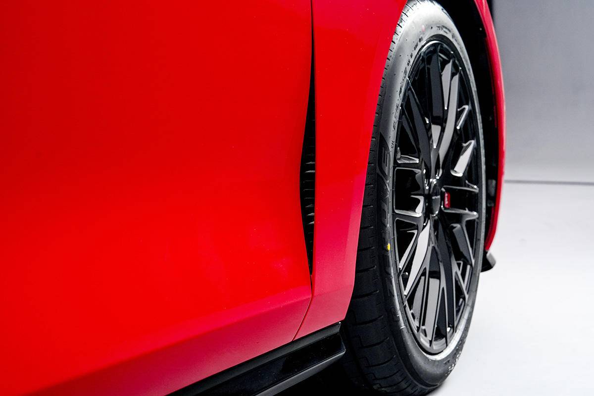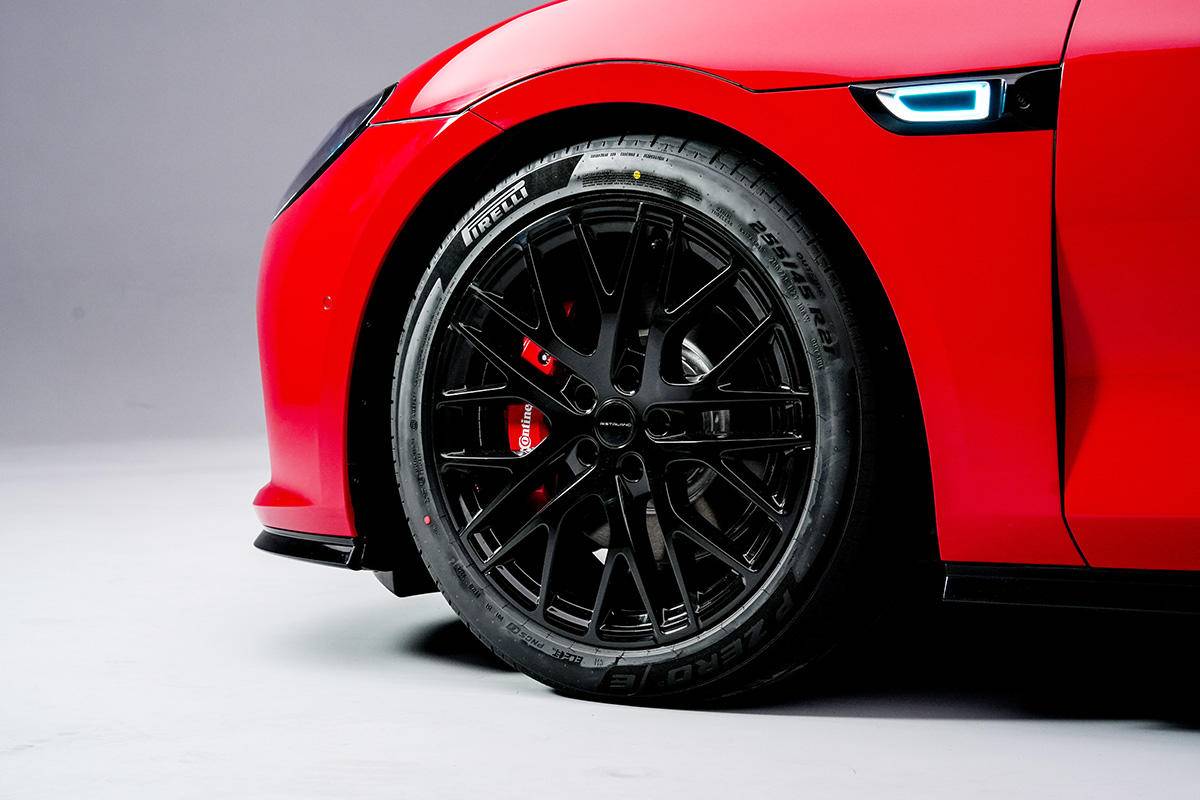 细节方面,前翼子板后侧带有智驾小蓝灯,前门前部内收的造型让翼子板形成了风道造型,车身底部突出的下包围使用了黑色的涂装。