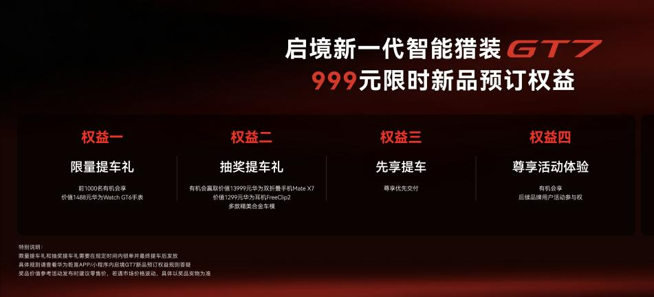 即日起,用户可通过启境汽车官网、华为乾崑APP、华为乾崑小程序参与999元盲订,尊享多重专属权益: