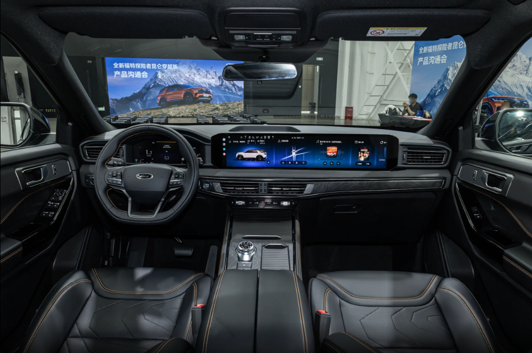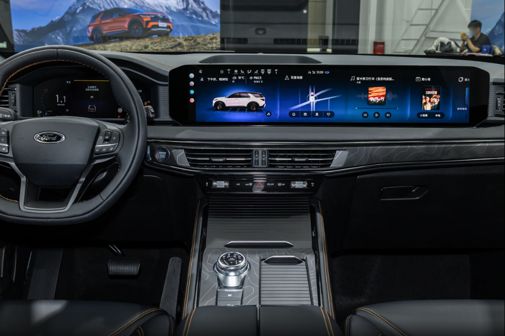 拉开车门,还是大家熟悉的探险者风格,但细节上确实更有质感了。整个中控是环抱式的,27英寸4K大屏跟 12.3英寸的全液晶仪表连在一起,一通电亮起来,视觉效果直接拉满。我上手滑了几下,用的是SYNC+3.0系统,还带5G联网,反应特别快,点菜单、切地图、划页面都很流畅,一点不卡顿,用着很顺手。