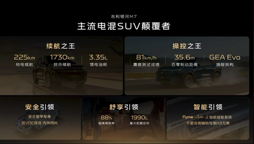 吉利银河M7的爆款潜质,不是在主流混动市场既定的内卷赛道里,把油耗再抠下0.1L、把续航再多堆个几十km的微突破。它真正的杀伤力,在于推翻行业沿用多年的竞争规则,重新划定主流电混SUV的价值坐标系。