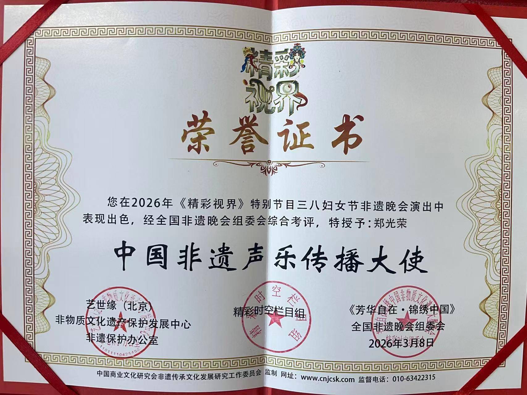 非遗吆喝传承人郑光荣凭借精湛的舞台表演与突出的文化传播贡献,被艺世缘(北京)非物质文化遗产保护发展中心、非遗保护办公室、精彩时空栏目组、《芳华自在·锦绣中国》全国非遗晚会组委会联合授予“中国非遗声乐传播大使”荣誉称号,以专业实力与坚守担当,为非遗吆喝传承再添重磅认可。