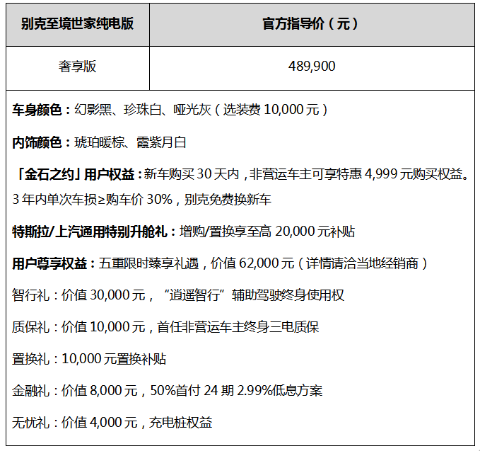 2026年3月17日 别克品牌宣布:旗下首款纯电MPV——至境世家纯电版上市,推出纯电奢享版一款车型,官方指导价48.99万元。至境世家纯电版延续“别墅级新能源旗舰MPV“定位,完整继承插混版车型的硬核实力,更以900V 6C超快充电池、“哑光灰”双拼色高定涂装、“金石之约”用户权益、特斯拉车主专属增换购礼遇等多项行业首发科技与权益,实现纯电出行体验的全面跃升。
