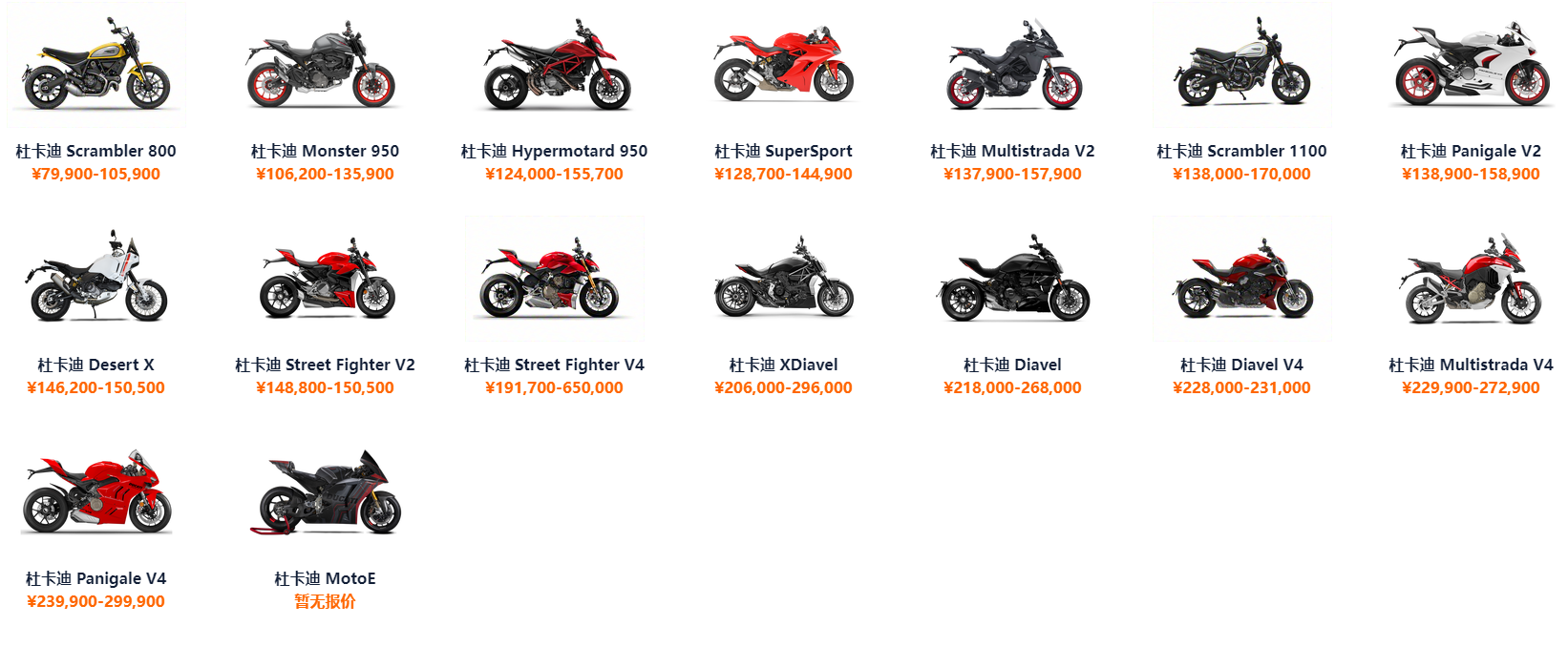 于是杜卡迪也必然会成为一个相对小众的品牌,如此强悍的动力等同于高昂的售价——杜卡迪Diavel的起售价达到21.8万元!相同预算已经能看到奥迪A5L或者AUDI E Sportback。然而该车还不算杜卡迪品牌最贵的车,该品牌目前的摩托车起售价依然在8万元左右,最高要超过六十万元,算的上是摩托车品牌里的高端品牌之一。