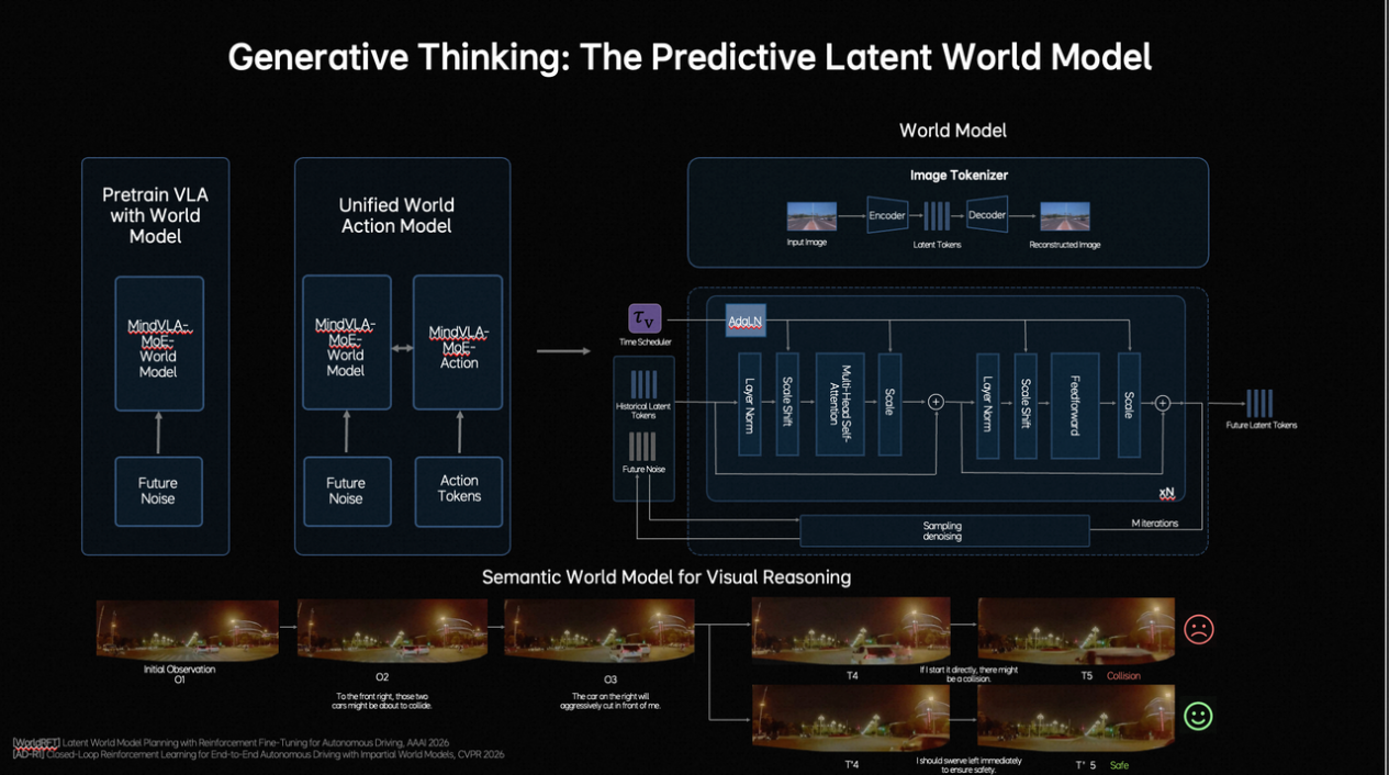 第二个重点是多模态思考能力。按照理想的解释,自动驾驶真正难的地方,不只是识别眼前发生了什么,更在于判断接下来会发生什么。比如旁边一台车有并线迹象,系统要预判它会不会切进来,以及自己是该减速、让行还是变道。为了解决这类问题,MindVLA-o1引入了预测式隐世界模型,也就是先把当前场景转成隐空间里的表达,再在这个空间里预测未来变化。这样做的好处是,不用直接去生成复杂画面,也能更高效地完成对未来场景的推演。