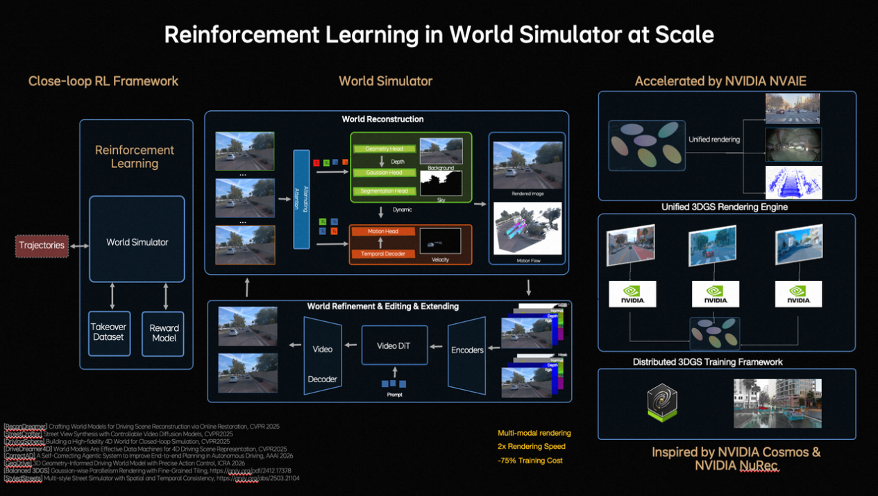 除了模型本身,理想还把强化学习闭环摆到了很重要的位置。过去很多辅助驾驶系统主要依靠人类驾驶数据来训练,优点是稳定,但局限也很明显,就是模型基本只能学已有样本里的东西。MindVLA-o1则进一步引入世界模拟器和闭环强化学习,希望让系统在仿真环境中不断试错、不断优化。官方称,依托统一的3D Gaussian Splatting渲染引擎和分布式训练框架,相关训练的渲染速度提升接近2倍,整体训练成本降低约75%。这意味着,很多原本靠真实道路慢慢积累的数据和经验,可以更快在模拟环境里完成迭代。