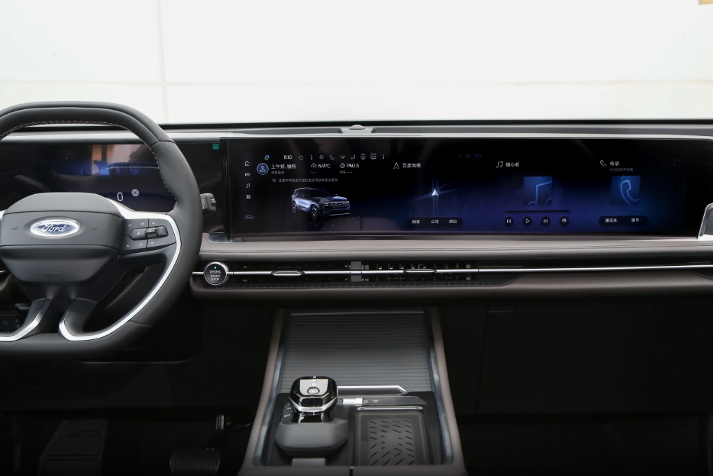 坐进驾驶位,一眼看到的是前面那块屏。2026款锐界L还是保留了这套设计,12.3英寸的液晶仪表加上一块大中控屏,不过版本不同屏幕尺寸也不一样,有13.2英寸和27英寸两种可以选。我试的这台配的是27英寸的,横过来看确实挺宽,显示也清楚。方向盘是三辐的,下半部分有一圈银色的装饰件,看着没那么沉闷。中控台那块布局挺规整,电子档杆、几个常用的物理按键、手机无线充电板,该有的都有。