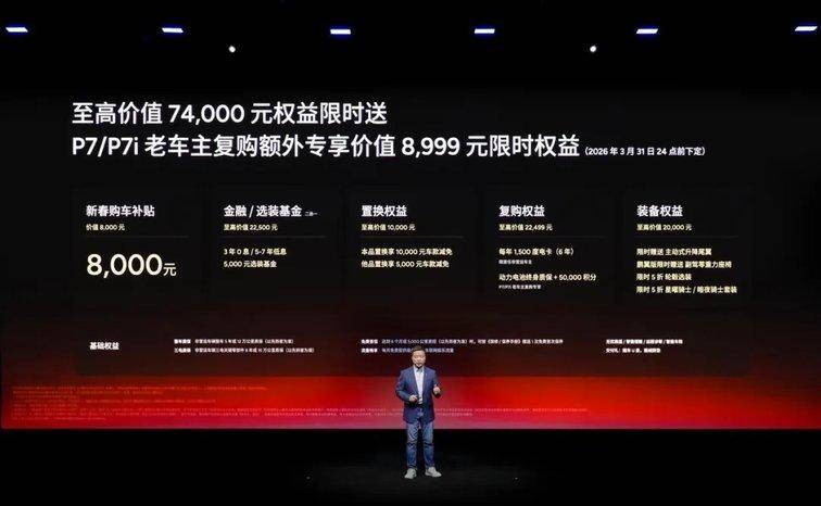 即日起至2026年3月31日24点前下定小鹏P7,用户可享受至高74,000元的配置限时送权益,包括价值8,000元的新春购车补贴,并可二选一享受5,000元选装基金,或3年0息/5-7年低息的金融购车权益;同时,置换用户可获至高10,000元置换权益,复购用户可享至高22,499元复购权益。在外观方面,小鹏提供了至高价值20,000元的装备权益,两款新色套装及轮毂选装的限时半价优惠,主动式升降尾翼限时赠送,购买鹏翼版车型的朋友还可额外获赠副驾零重力座椅。多重礼遇助力用户轻松开启智能出行生活。