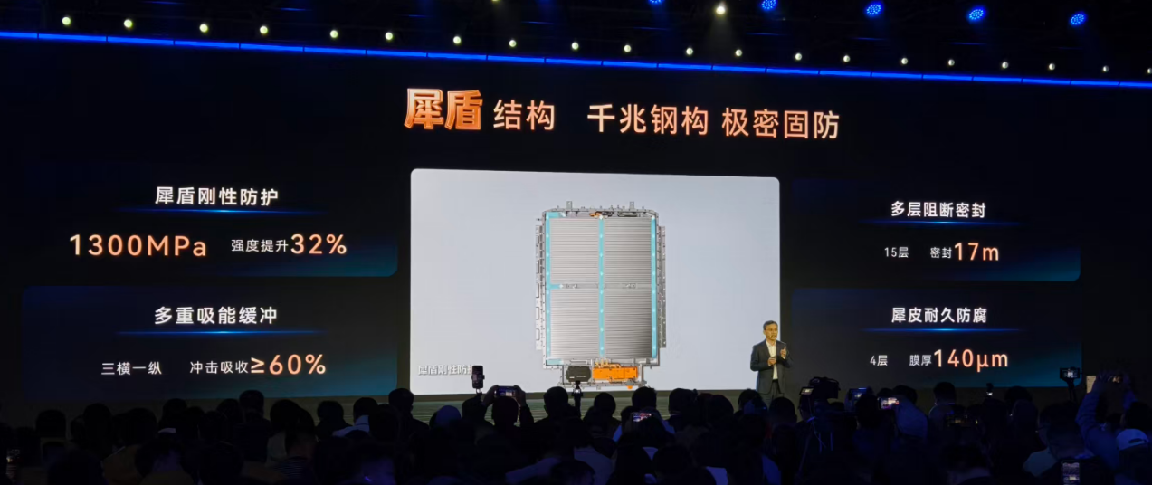 比如犀晶材料,对正极、负极、隔膜、电解液的控制标准,比国标还要严格,正极严16%、负极严20%、隔膜严14%、电解液严20%;还有犀盾结构,采用1300MPa的千兆钢构,强度提升32%,15层多层阻断密封,三横一纵的多重吸能缓冲,能有效抵御碰撞冲击。