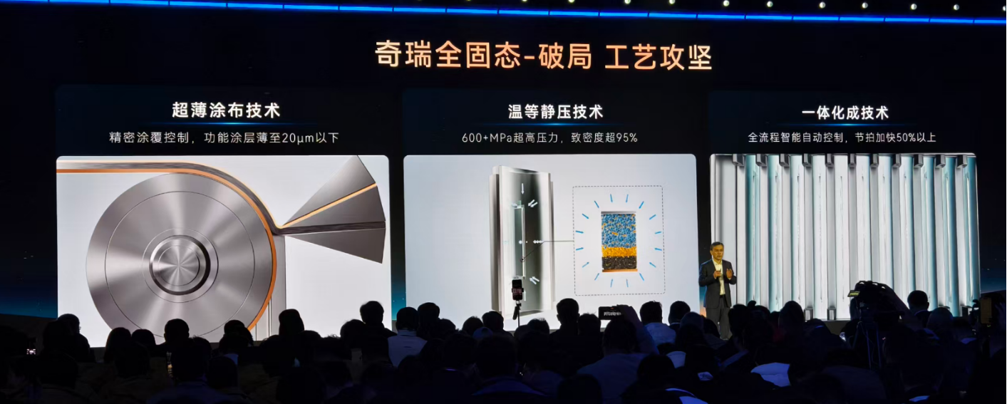 二是工艺升级,超薄涂布技术将功能涂层控制在20μm以下,温等静压技术采用600+MPa高压,让电池致密度超过95%,一体化成型技术不仅提升生产效率,还能提升电池稳定性。三是AI研发辅助,通过1μm电极微结构建模,优化上百项关键指标,迭代大量设计方案,大幅提升研发效率,也让电池的耐用性更有保障。
