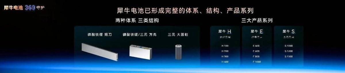 犀牛电池包含两种体系、三种结构,分别为磷酸铁锂短刀、磷酸铁锂方壳、三元方壳、三元大圆柱,包括H系列混动专用、E系列纯电专用、S系列固态专用三大产品系列。