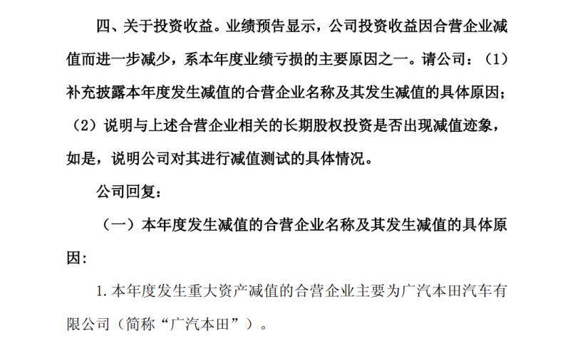 3月16日,广汽集团发布《关于上海证券交易所对公司业绩预告相关事项监管工作函的回复公告》,就市场关切的业绩波动问题正式回应。公告明确,合营企业资产减值导致公司当期投资收益进一步减少,成为年度业绩亏损的主要诱因之一,而计提大额资产减值的核心主体,正是曾作为广汽集团“利润基石”的广汽本田汽车有限公司。