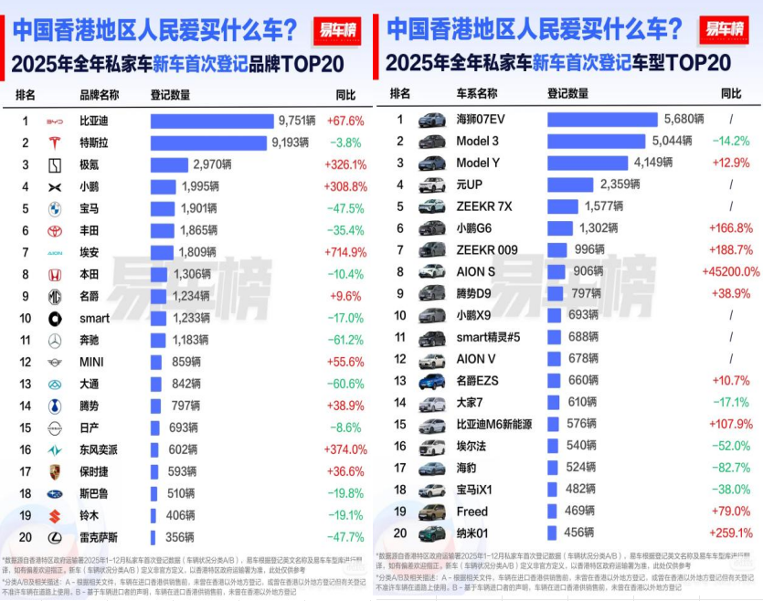 去年年初,比亚迪便已显现领跑态势。香港运输署数据显示,2025年1月比亚迪新车注册量为849辆,登顶单月销量榜首 。进入年中,凭借海狮07EV、海豹、元PLUS等车型的强劲表现,比亚迪连续多月成为香港市民最青睐的汽车品牌;上半年累计销量达4902辆,超越特斯拉(3889辆)位居市场第一,市场占有率高达26.71% 。全年力挫特斯拉,新车登记9751辆创下历史新高,较2024年同比劲增68%,毫无悬念地斩获 2025 年香港全品牌销量桂冠。2026年伊始,比亚迪稳扎稳打,新车销量继续保持领先势头。