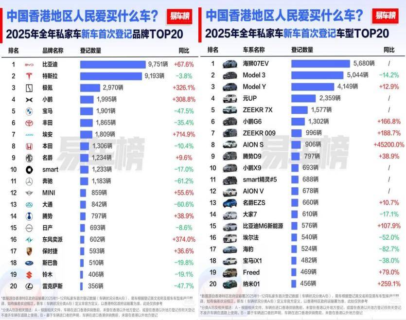 去年年初,比亚迪便已显现领跑态势。香港运输署数据显示,2025年1月比亚迪新车注册量为849辆,登顶单月销量榜首 。进入年中,凭借海狮07EV、海豹、元PLUS等车型的强劲表现,比亚迪连续多月成为香港市民最青睐的汽车品牌;上半年累计销量达4902辆,超越特斯拉(3889辆)位居市场第一,市场占有率高达26.71% 。全年力挫特斯拉,新车登记9751辆创下历史新高,较2024年同比劲增68%,毫无悬念地斩获 2025 年香港全品牌销量桂冠。2026年伊始,比亚迪稳扎稳打,新车销量继续保持领先势头。