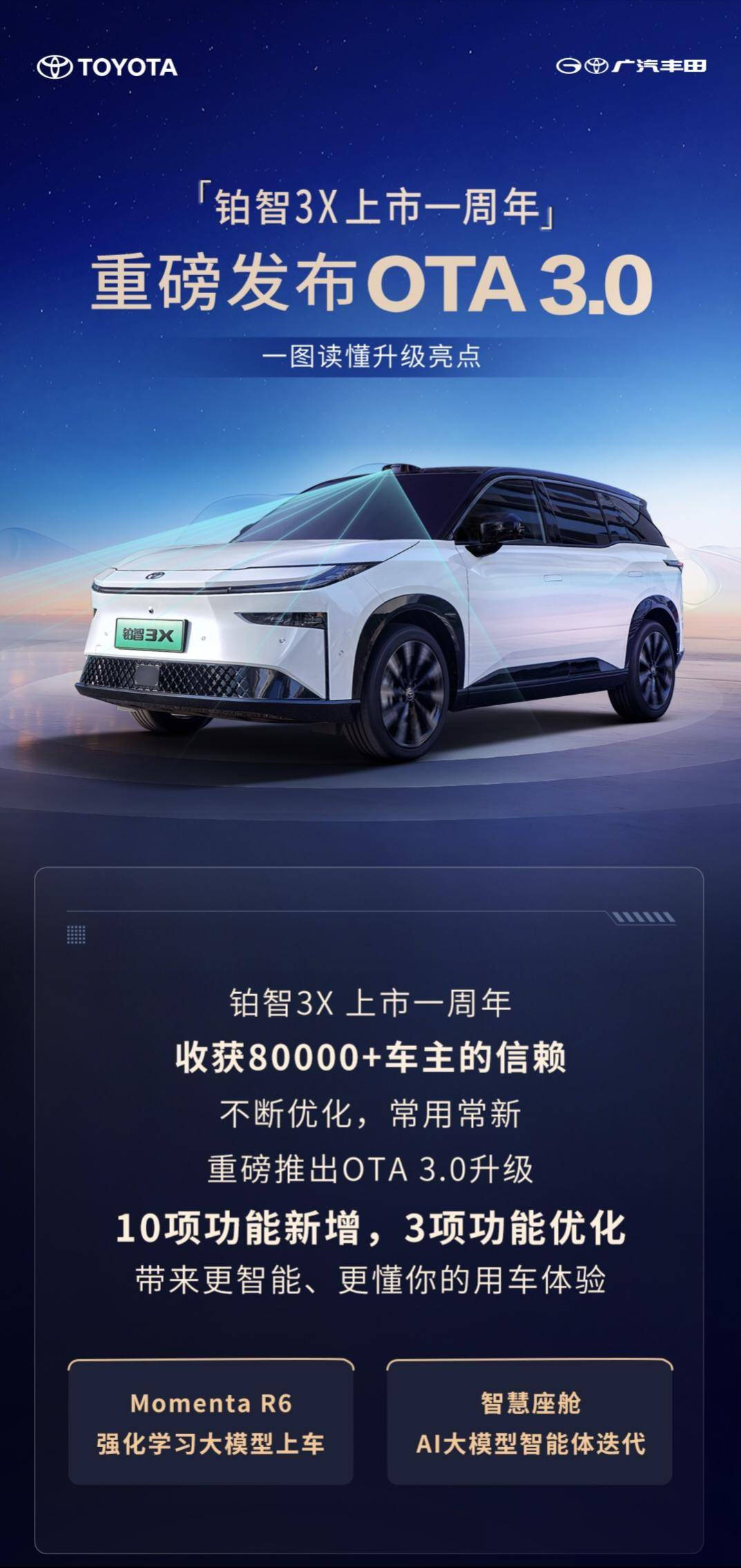 更为关键的是,作为一台合资品牌的新能源车型来说,超8万辆用户选择铂智3X说明用户自己愿意买。而上市一年后还在持续升级,则说明广汽丰田愿意持续投入,所以此次老车主在此次OTA升级当中也能免费升级Momenta R6强化学习大模型,也就不足为奇了。