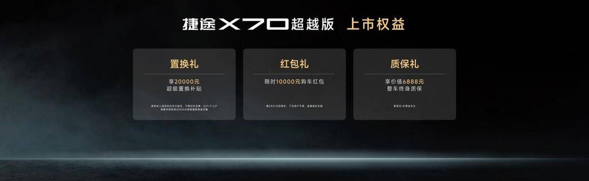 发布会现场,2026款捷途X70超越版的官方指导价及专属购车权益正式公布。2款车型官方指导价9.99万元-10.39万元,提供3重购车豪礼,限时抢购价6.99万元-7.39万元,让更多家庭轻松拥有顾家派宽体大七座,奔赴向往的生活。