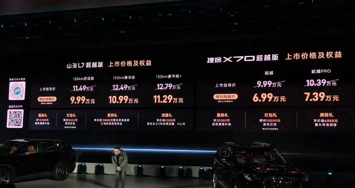 捷途 X70 超越版官方指导价 9.99-10.39 万,限时直降 3 万干到 6.99-7.39 万;山海 L7 超越版指导价 11.49-12.79 万,限时 9.99-11.29 万就能拿下。