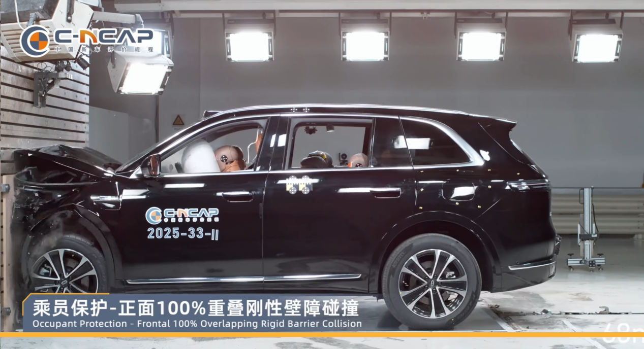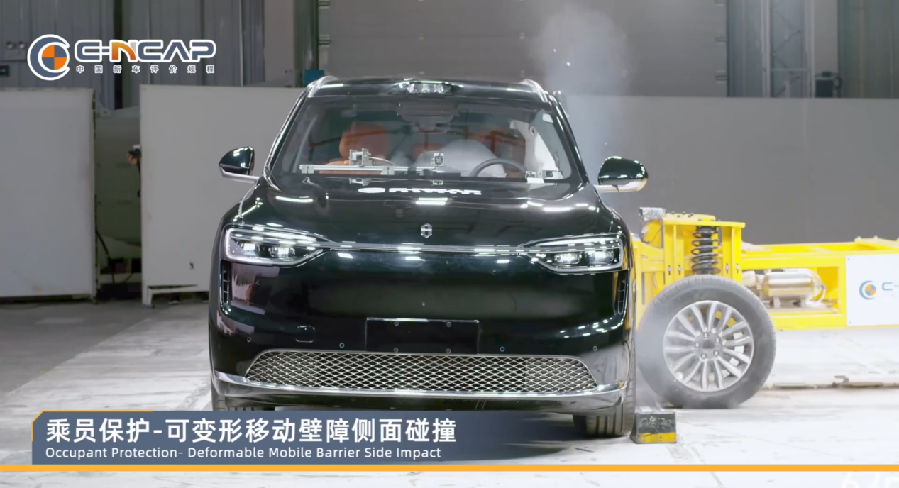 其中,在正面碰撞测试时,车辆A柱无变形,乘员舱结构完整,车内安全气囊顺利弹出,充分保障了乘员舱的完整性与驾乘人员的生存空间。在侧面碰撞测试时,车辆侧气帘、远端气囊和座椅侧气囊均及时顺利展开,避免了乘员头部与车内饰件等发生直接接触,有效提升了极端情况下的防护水平。